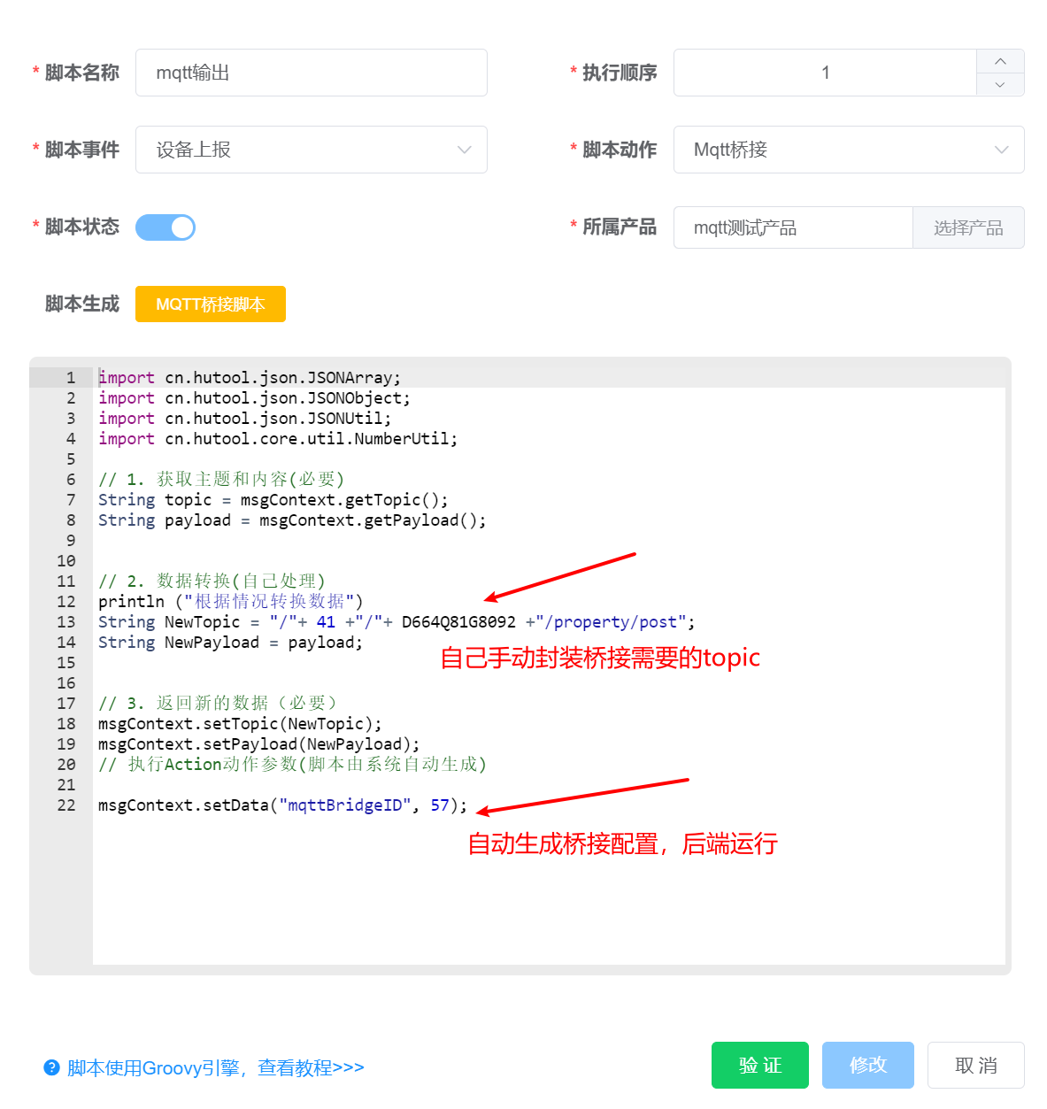 脚本数据选择MQTT接入--点击选择Mqtt桥接接入点--修改脚本内容即可