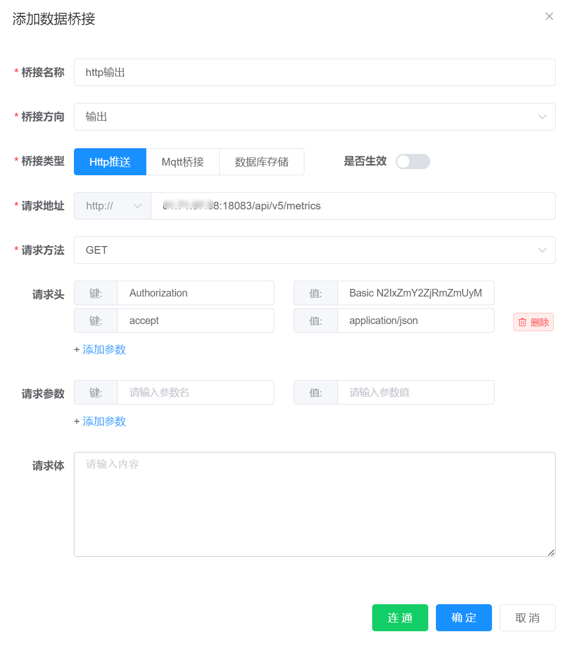 桥接地址:api访问的完整地址,例:http://localhost:18083/api/v5/metrics