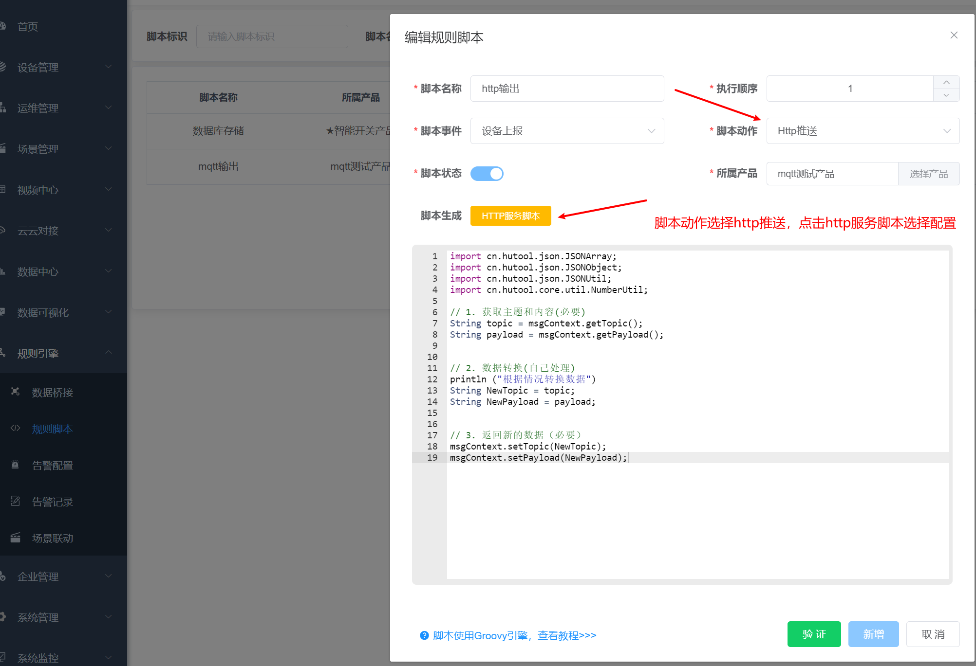增加http桥接输出规则脚本: 规则引擎-->规则脚本-->新增