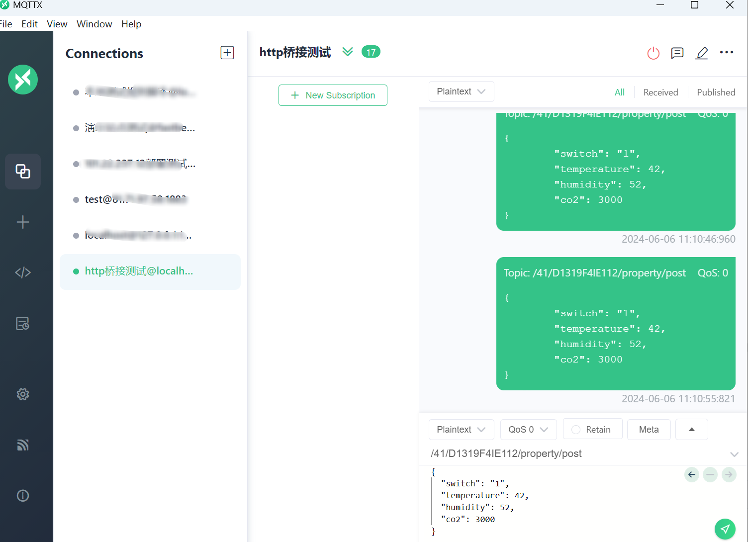 4、输出侧测试--使用mqttx模拟设备上报数据测试