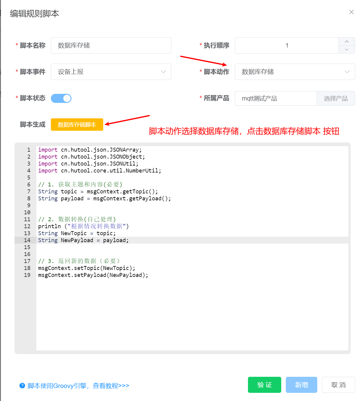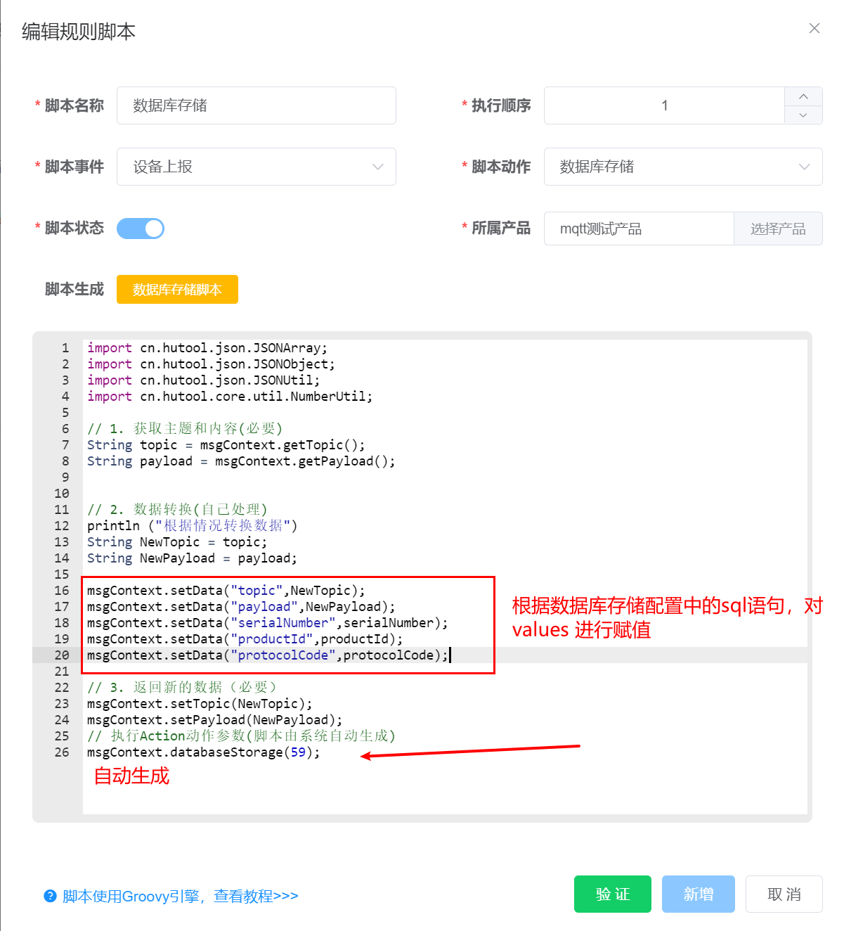 - 创建mqtt输出脚本: 规则引擎-->规则脚本-->新增