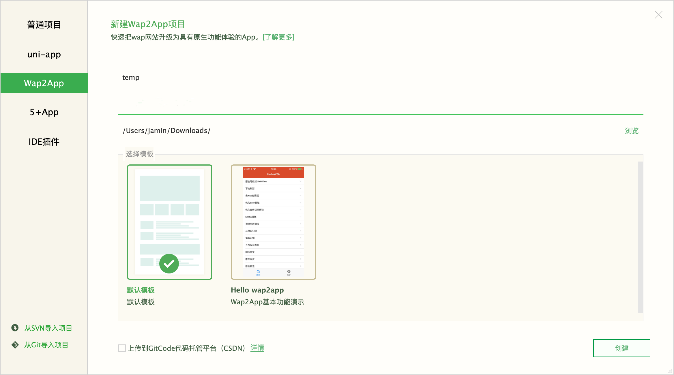 1、在HBuilderX中选择文件-新建-项目,创建Wap2App项目,项目名自定义,wap站首页地址为H5部署地址,模板可以选择默认模板。