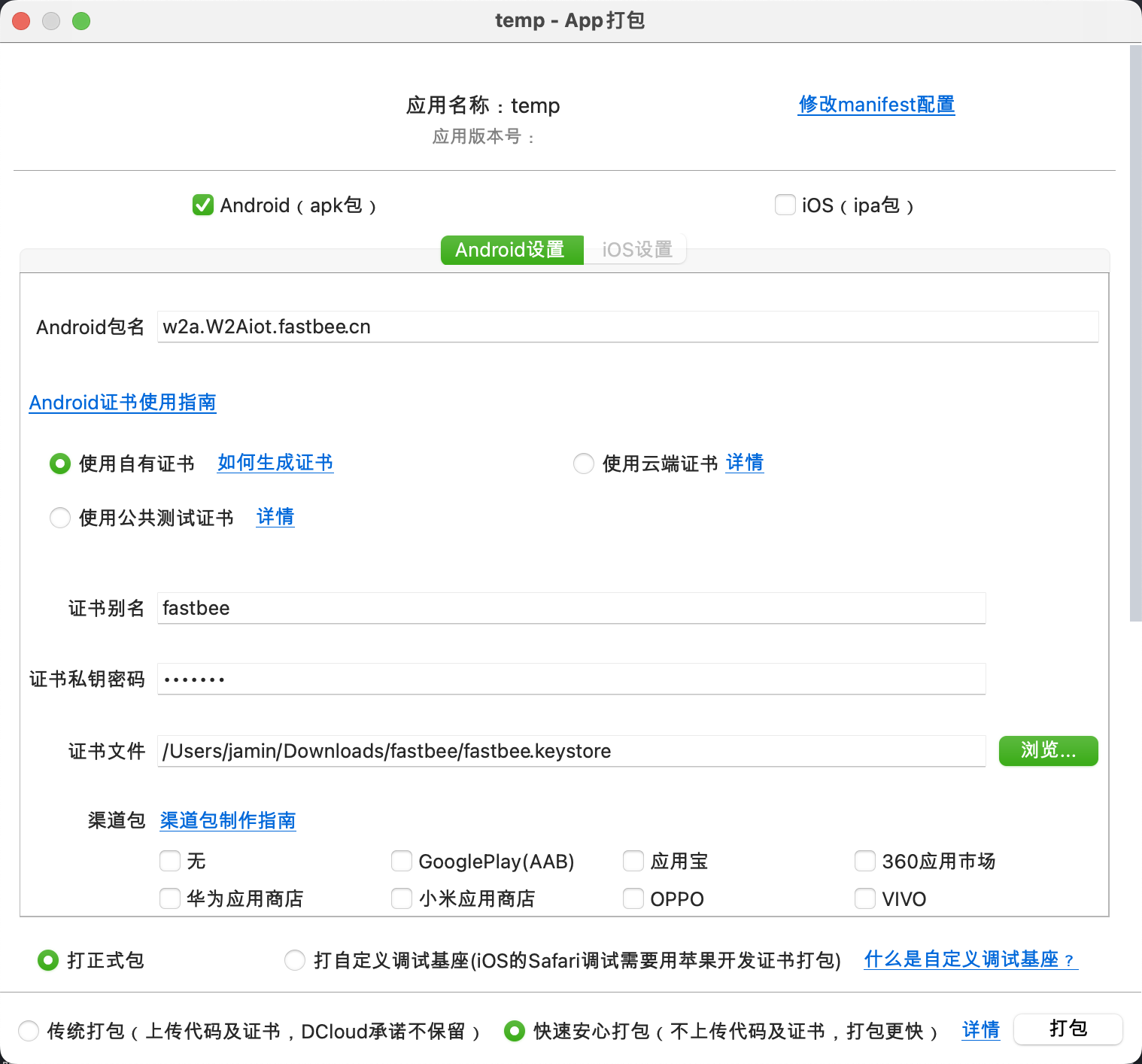 4、建议使用自有证书,避免打包中出现一些奇怪的问题。